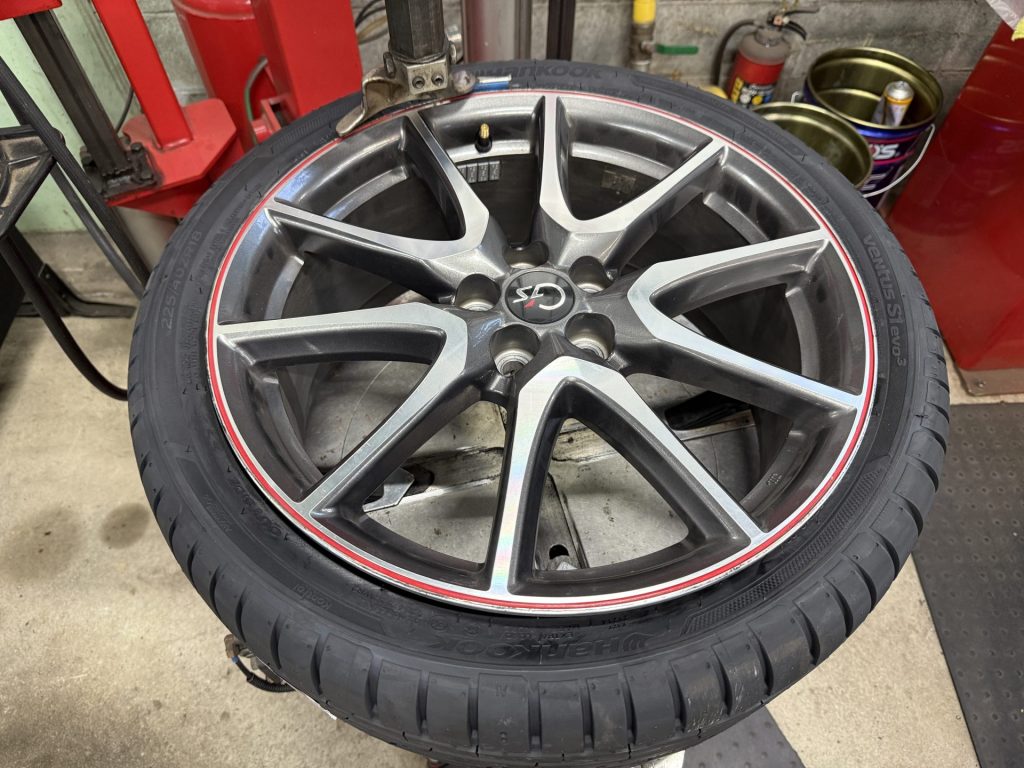 タイヤの溝も車検に通せないほどの残り溝だったため、このタイミングで交換します。タイヤはアジア系メーカーの中でも信頼度の高いハンコック製のタイヤに交換します。安定感とルックス重視でタイヤ幅を純正の215幅から225幅に上げています。
