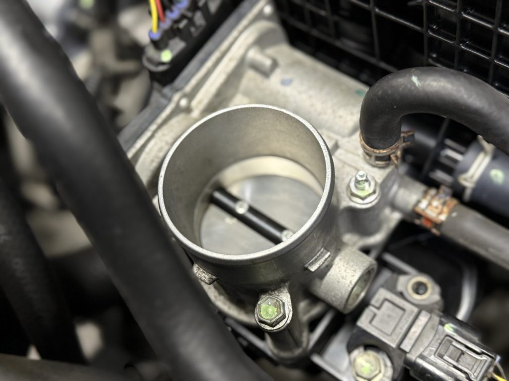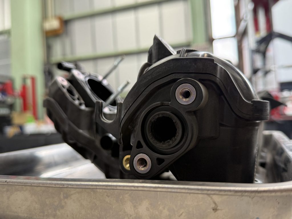 その他の部分として、EGRバルブだけではなく、写真のインテークマニホールドの清掃や、アクセルを踏んだ際に開閉するスロットルバルブの清掃も行い、さらなる走りの最適化を進めていきます。