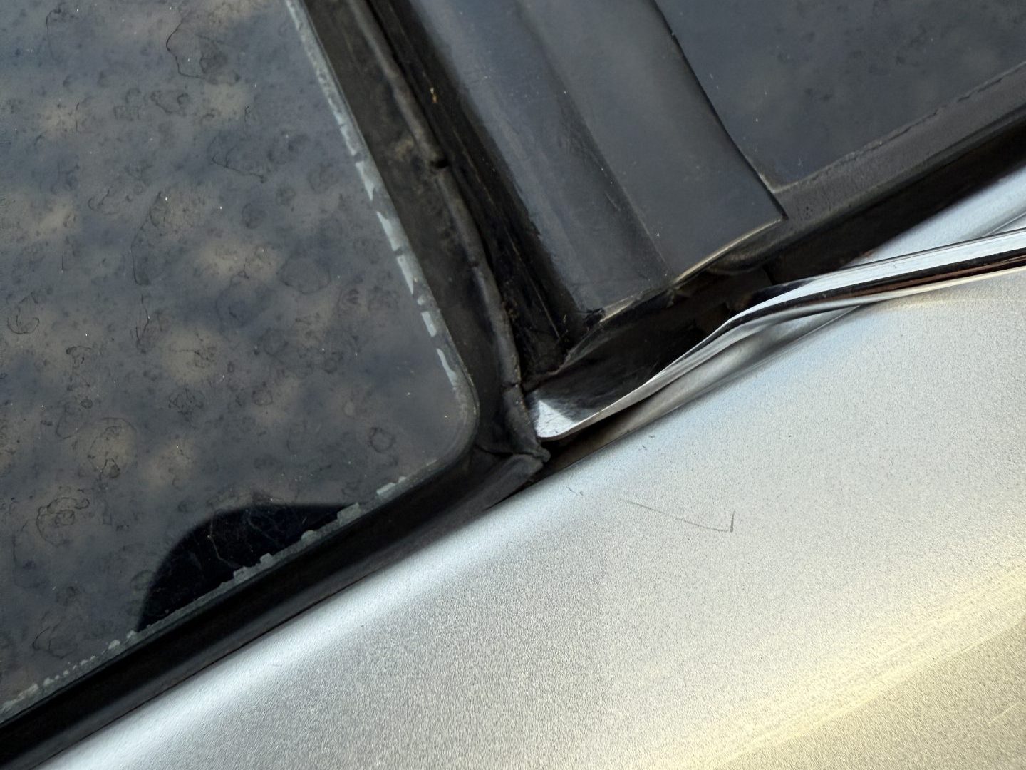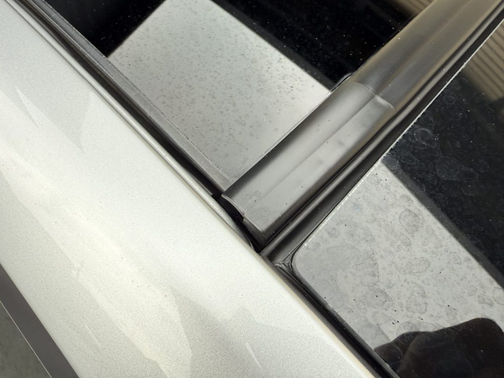 続いてのメンテナンスは、ガラスのモールやサンルーフ先端のモールの修理です。お客様はこちらのモールの劣化、フィッティングの悪さを気にされていて、確かにモールのひび割れや、サンルーフモールが少し浮いたような状態になっています。