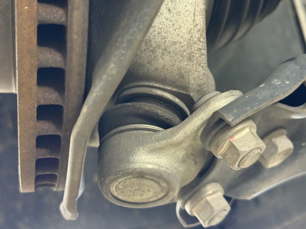 写真のロアボールジョイントのブーツには深めの亀裂が見られました。このような部分は走行距離的なところのダメージと、経年劣化によるダメージも起こります。車検の基準では破れがないため必ず交換が必要というわけではありませんが、この先の2年間の走行距離が多くなる見込みだという事でしたので、予防的に交換をしていきます。走行距離が少ない場合でも、理想的な状態で乗るにはある程度のメンテナンスは必要です。中古車を選ぶ際は、一概に走行距離で選ぶのも難しい段階になっているとも言えます。