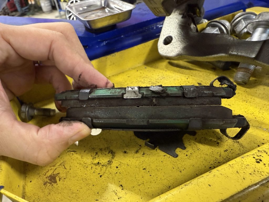 ブレーキパッドについては、写真のように内側と外側を比べると偏摩耗が見られます。ブレーキパッドの消耗は走行されるシチュエーションによっても変わりますが、渋滞の多い街中の走行では意外と消耗が早くなることも特徴です。偏摩耗についてはブレーキキャリパーの動きが悪くなっている事も原因の1つです。