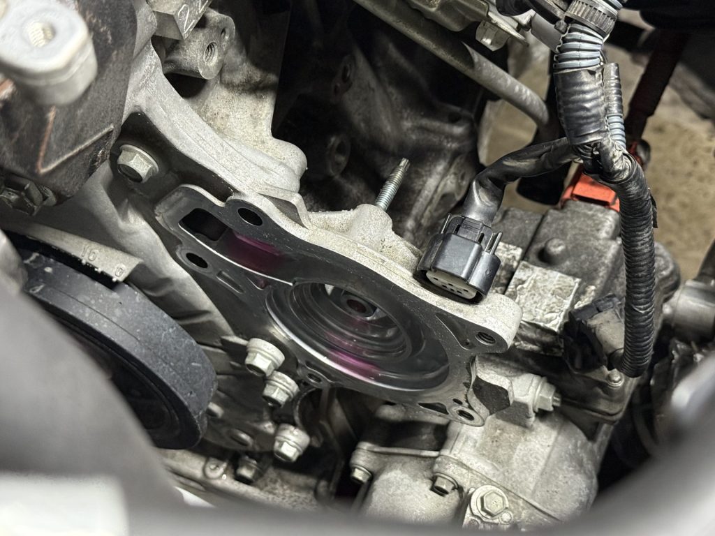 続いてはエンジン側のウォーターポンプ、ハイブリッドシステムがわのウォーターポンプの交換です。昨今ではウォーターポンプ周辺から冷却水が漏れた形跡がある車両も見られます。交換の際はウォーターポンプの当たり面のチェックも行なっています。