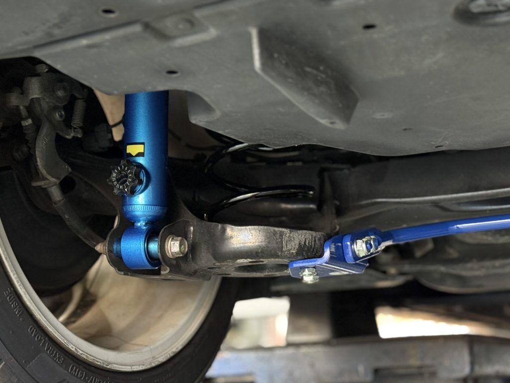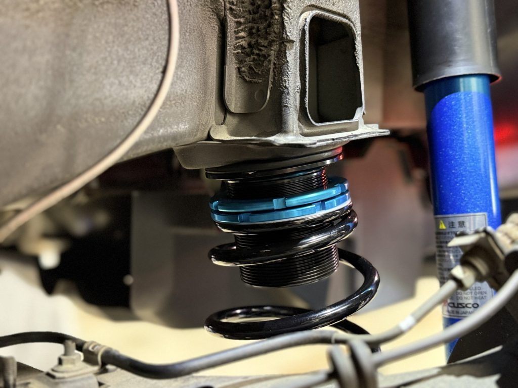 今回はとルックスのバランスを整えるために新品の車高調を装着しますので、リジカラ、リアスタビライザーの追加を行います。この辺りは弊社的に『新車時でもこのぐらいは欲しい』と思える効果のある補強パーツです。足回りの硬さに合わせた不快感を持たせない補強で、新車時を越える質感を狙っていきます。