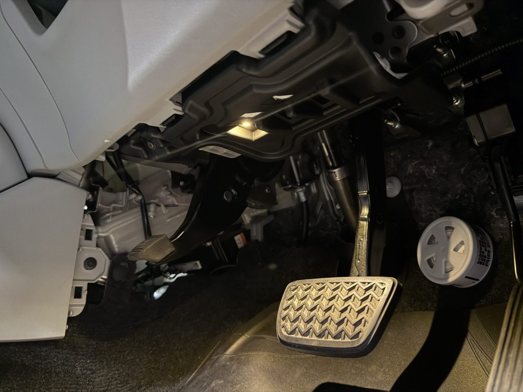 ブレーキ周りのメンテナンス、アップグレードに加えて、インテリアに少しアップグレードを施します。今回ご依頼いただいたのは『フットランプ』です。フットランプは車内の足元を照らしてくれる照明で、30系プリウス前期型ではGグレード、ソーラーパネル付きムーンルーフ装着車に装着され、後期型ではGグレードに標準装備となったものです。純正装着仕様の場合は、ギアをドライブ、リバースに入れると減光される点灯方式となります。