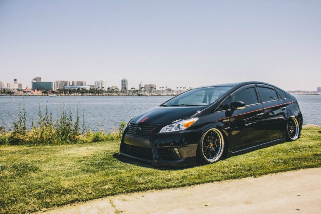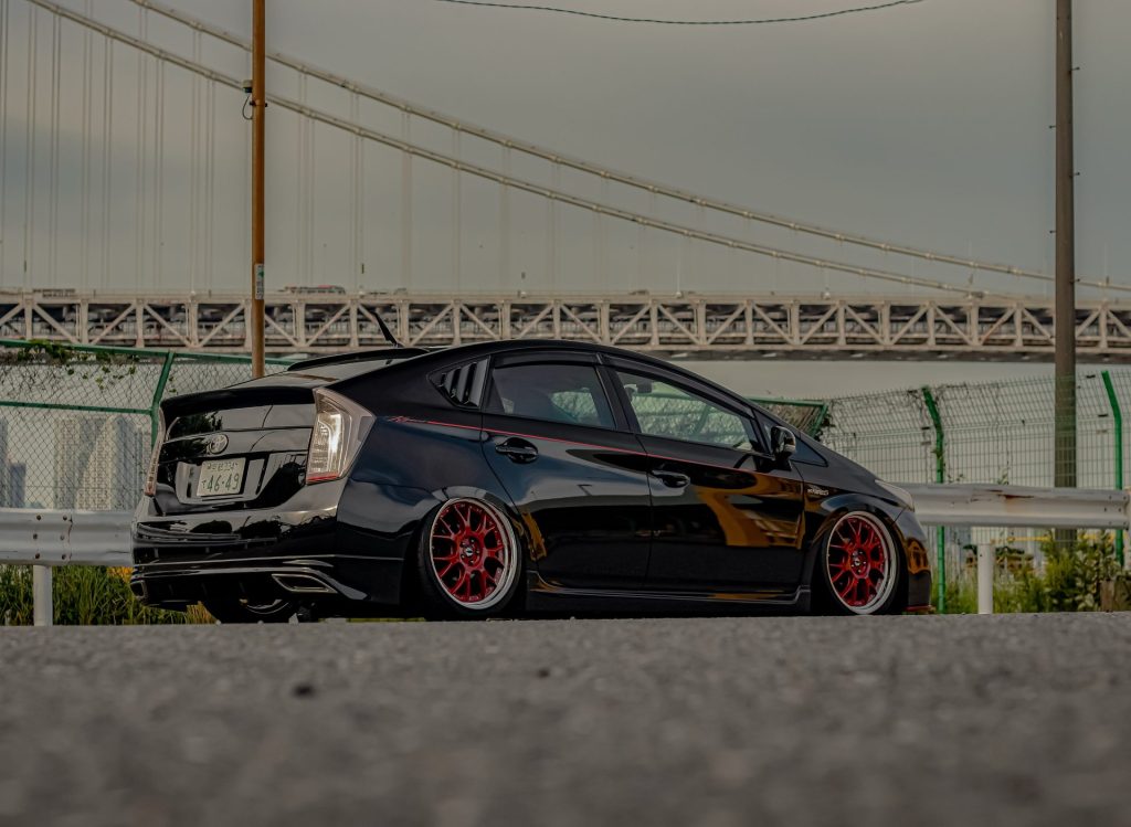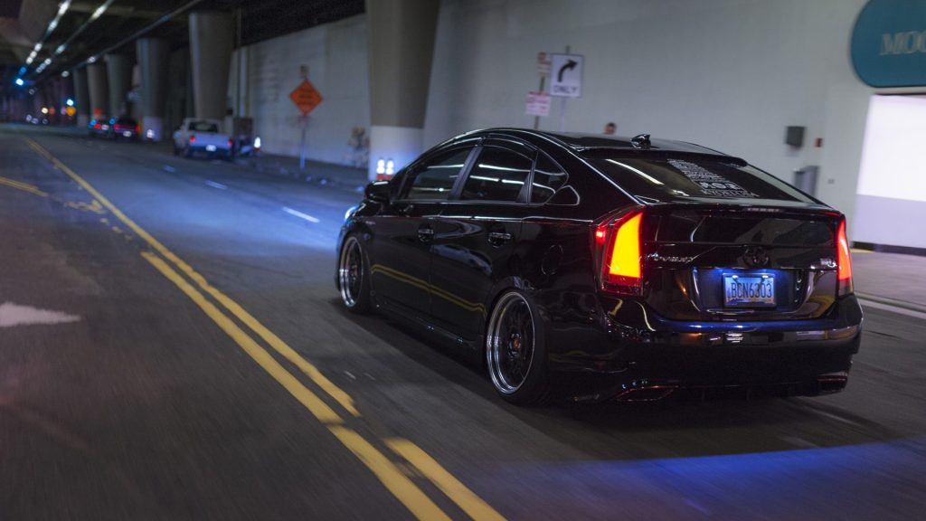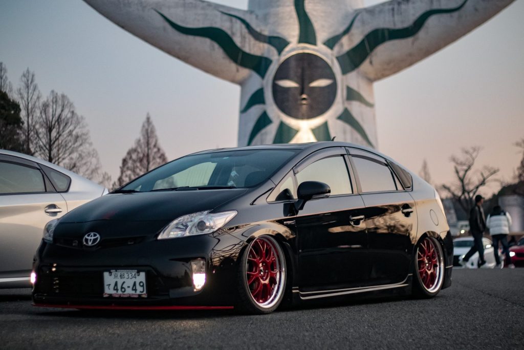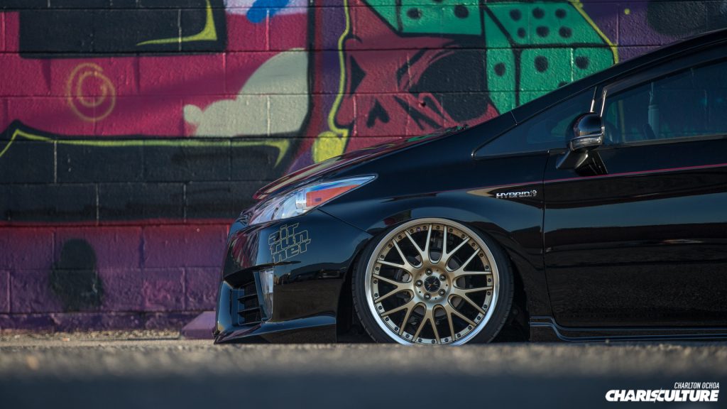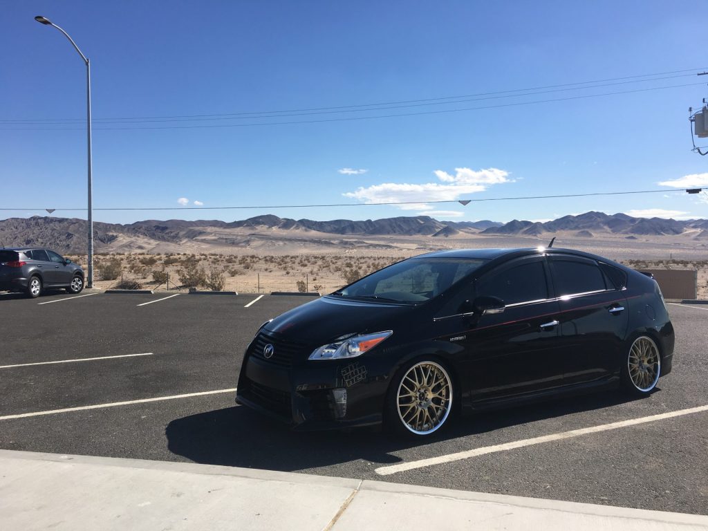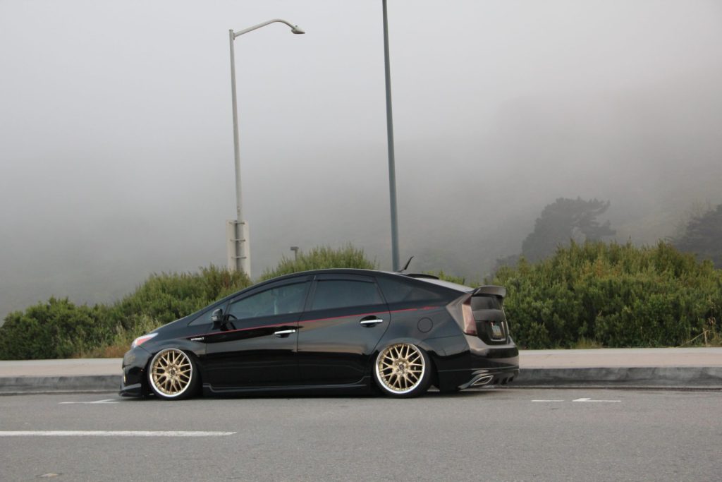 Kyoei USAのプリウスはイベントへの出展に使う一方で、通勤やお買い物など、日常的に毎日乗るクルマとしても活躍していました。この辺りはエアサスで車高を自在に操れることや、過度なキャンバー角をつけたり無理なタイヤサイズを選ばないなど、毎日乗るためのセッティングに拘ったことによる恩恵です。