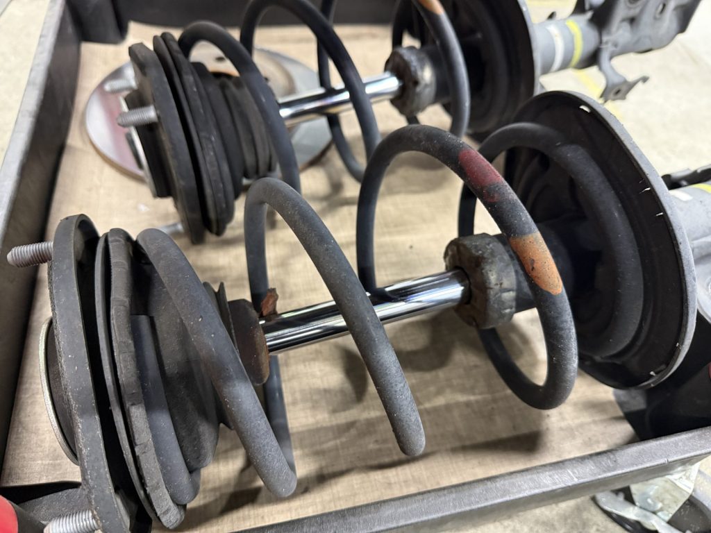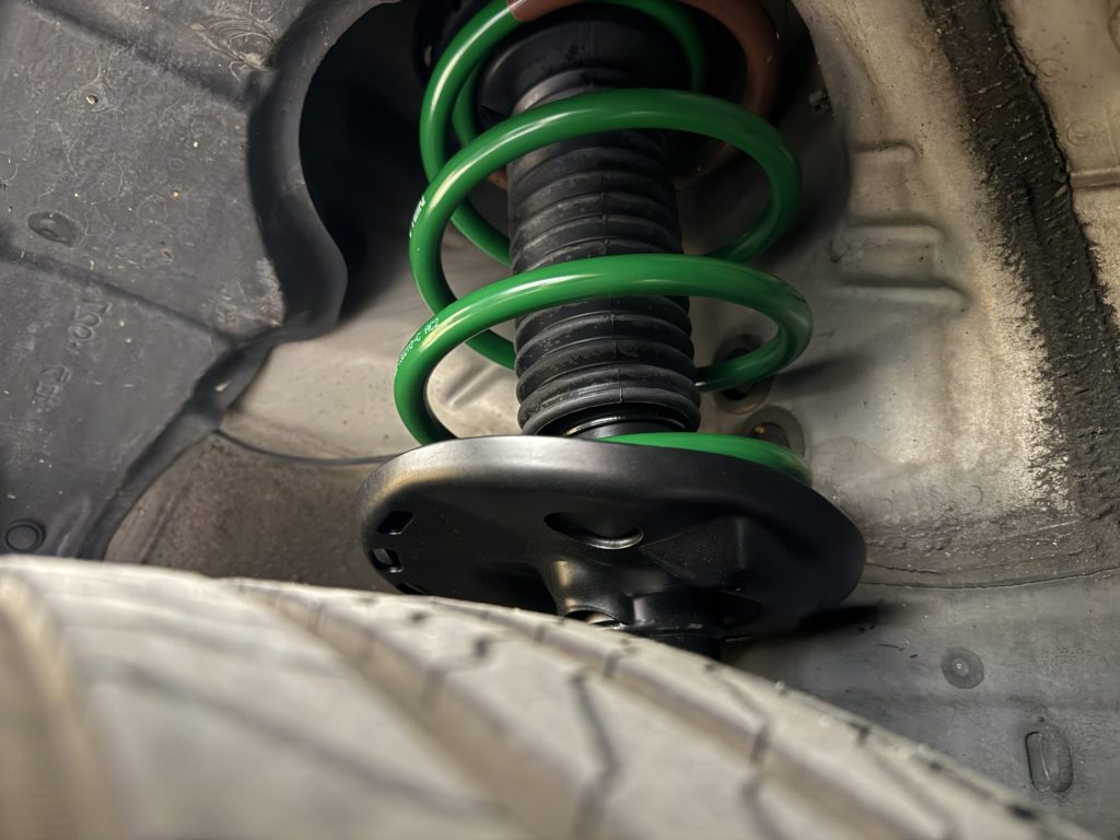 今回は純正品のパーツではなく、 TEIN Endura Pro Basicというショックアブソーバに、同社の純正形状のコイルスプリング OE Techの組み合わせです。コイルスプリングは著しい錆などがなければ再使用も可能ですが、経年劣化で性能の悪化も感じられる部分です。新品のコイルスプリングを組んだ車両と乗り比べると、交換された車両の方が乗り心地が良いなと思うことは多いです。
