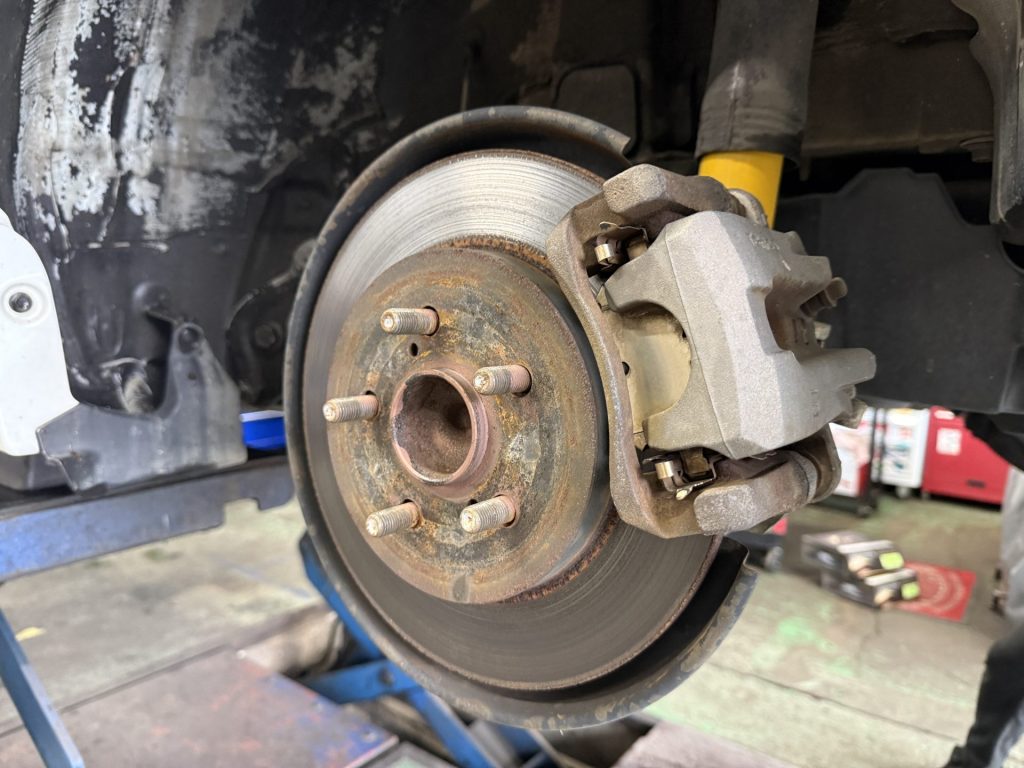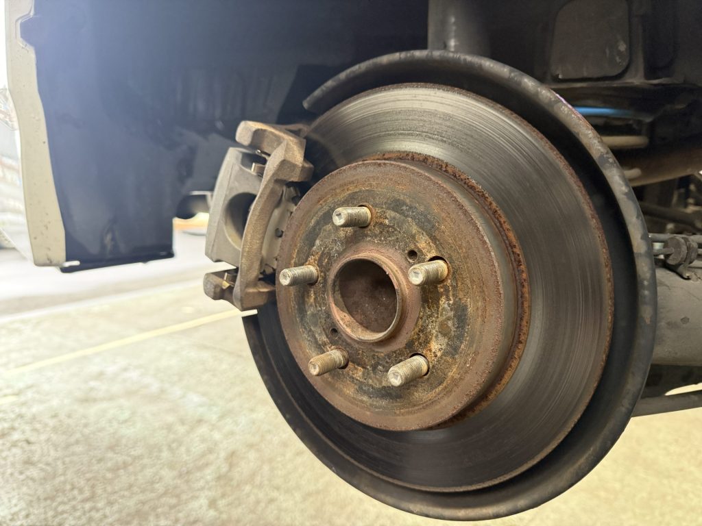 今回お客様にご依頼いただいたメンテナンスは、ブレーキ周辺のメンテナンス、部品交換です。プリウスにはモーターによる回生ブレーキ機構が備わるものの、従来のガソリン車と同じ油圧で作動するブレーキも備わります。回生ブレーキの恩恵でこちらのブレーキが動作するシーンも限定的にはなりますが、それ故に錆によるトラブルが起きやすいことも特徴です。